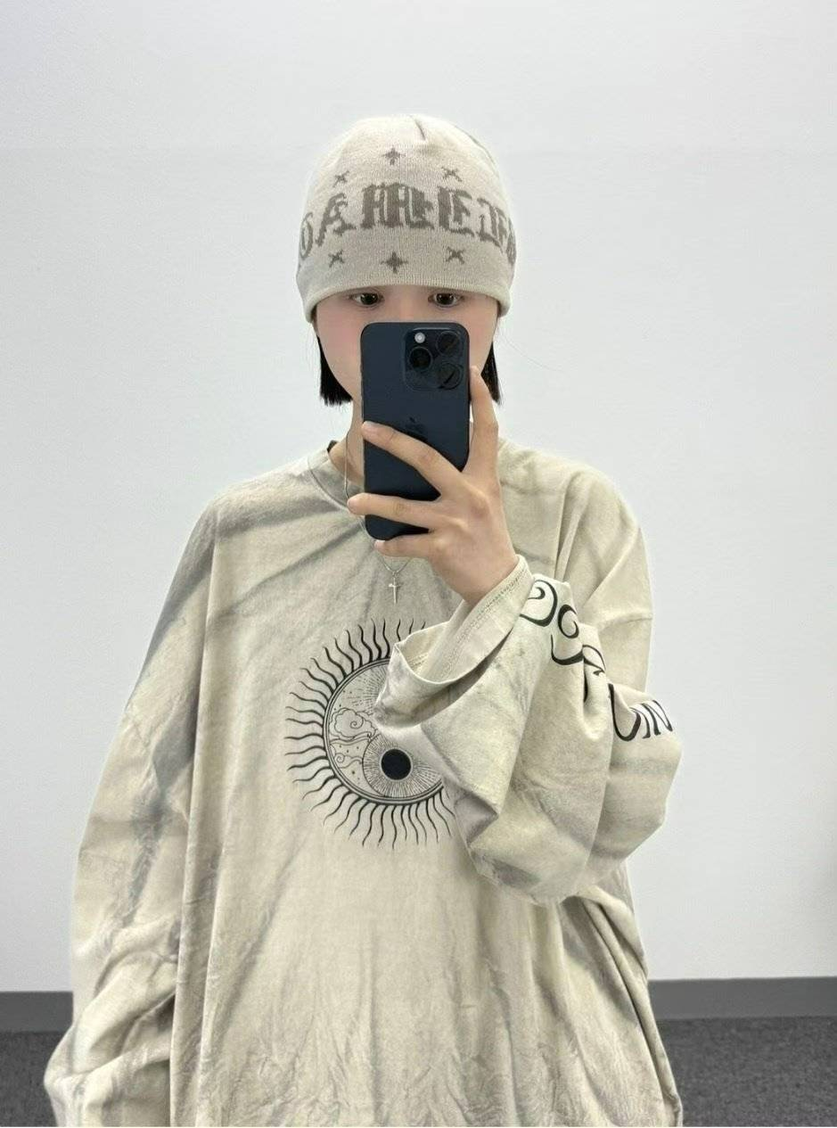 灰/杏 太陽月亮圖騰刷染Oversize長袖