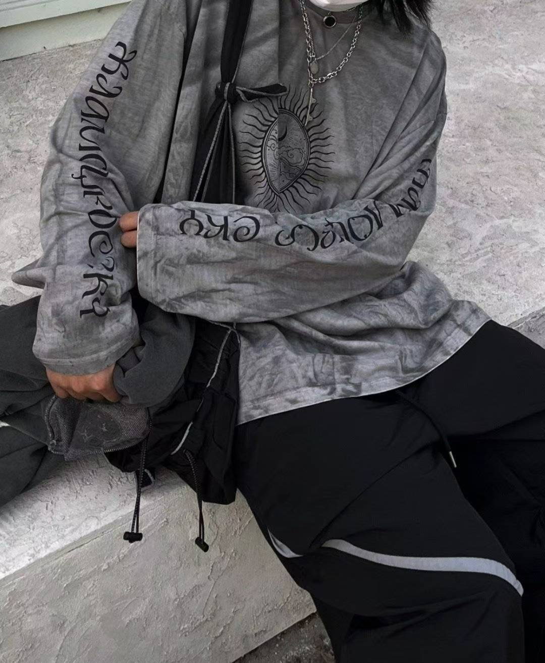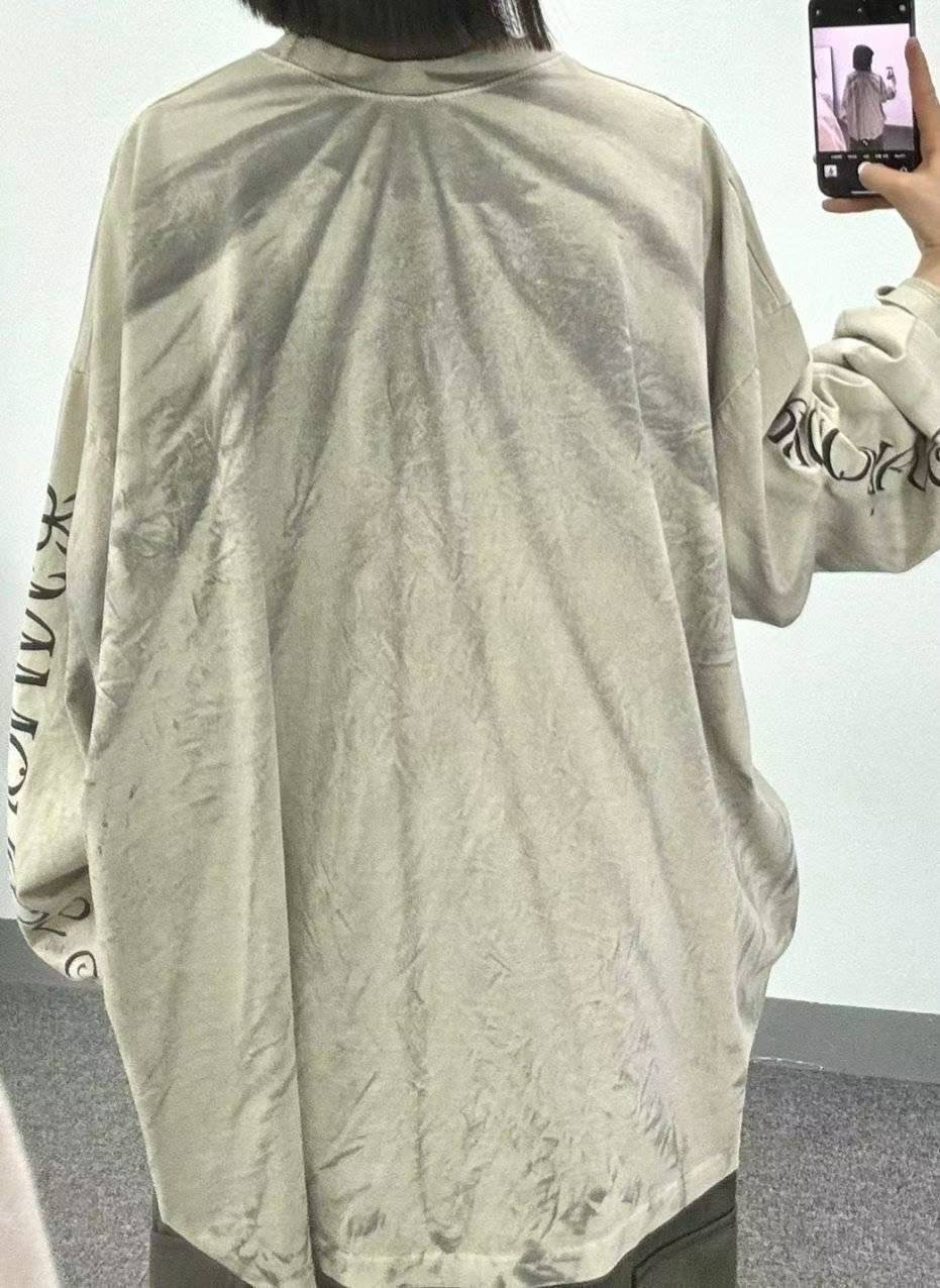 #古著刷染 #灰杏上衣 #冷淡風長袖 #太陽月亮圖騰 #中性OVERSIZE #寬鬆落肩上衣 #灰黑系穿搭 #極簡冷感 #工裝風穿搭 #街頭感 #韓系中性 #JOICEKOREA #秋冬長袖穿搭 #冷感系單品
