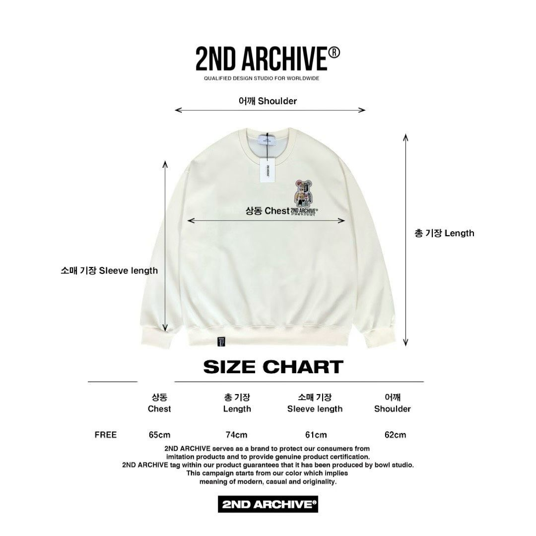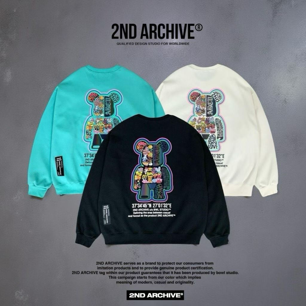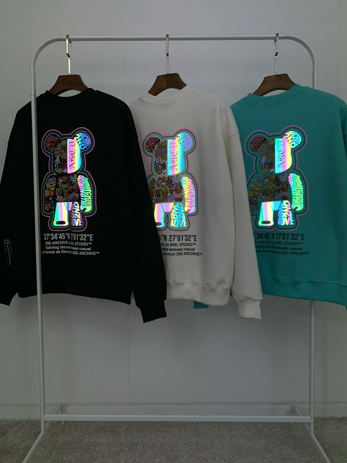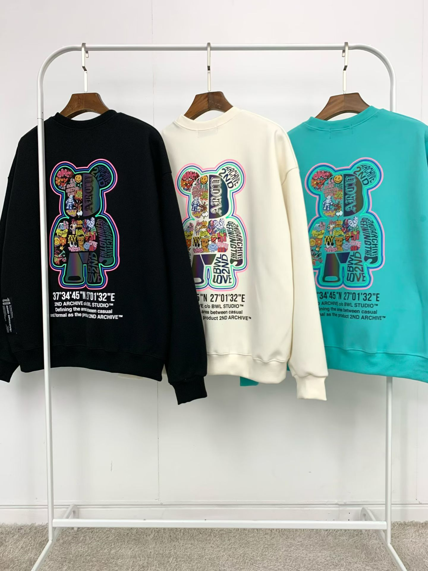 2ND ARCHIVE 正韓反光塗鴉熊熊寬版衛衣 黑/奶油/湖水綠