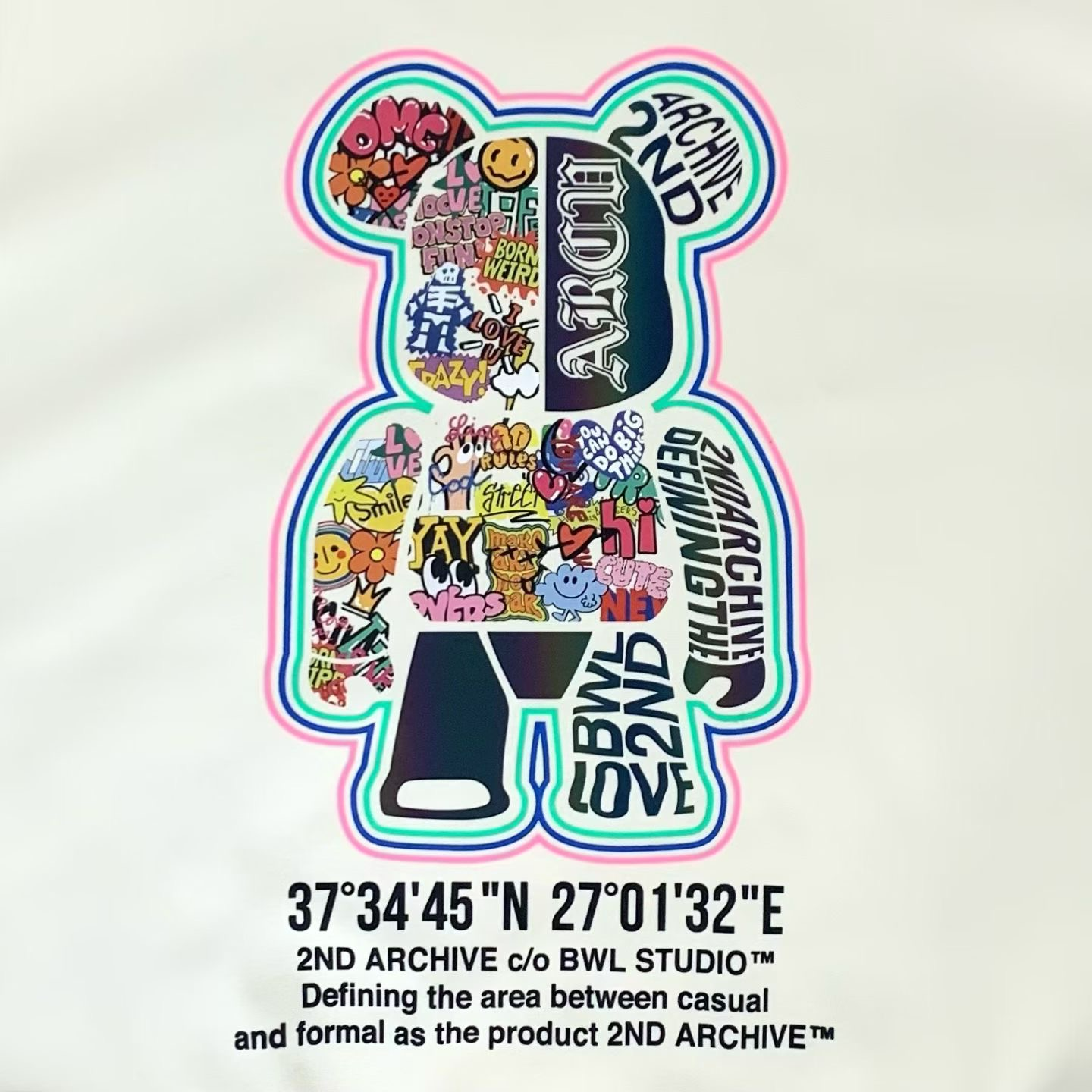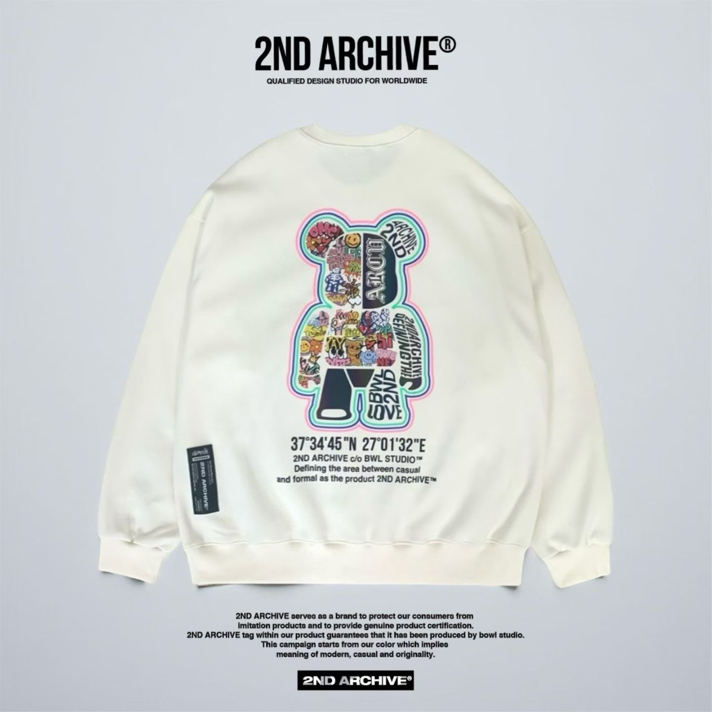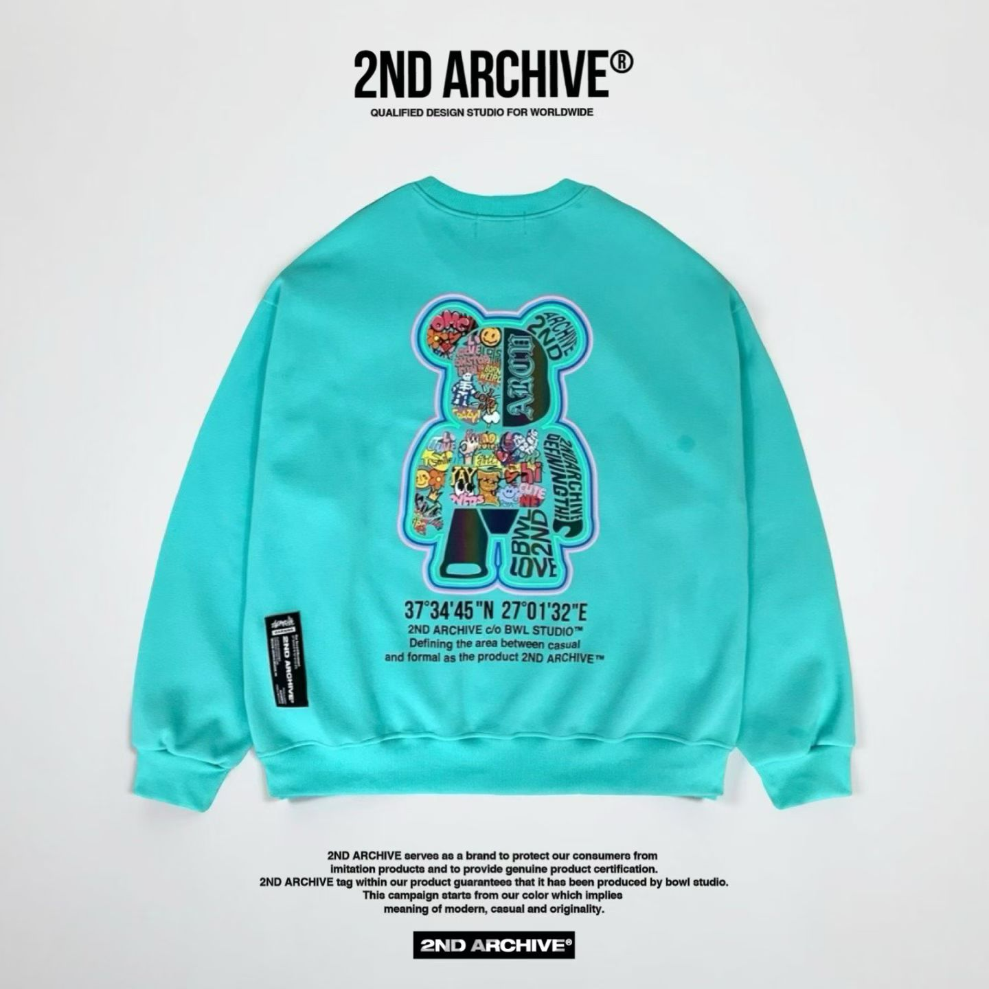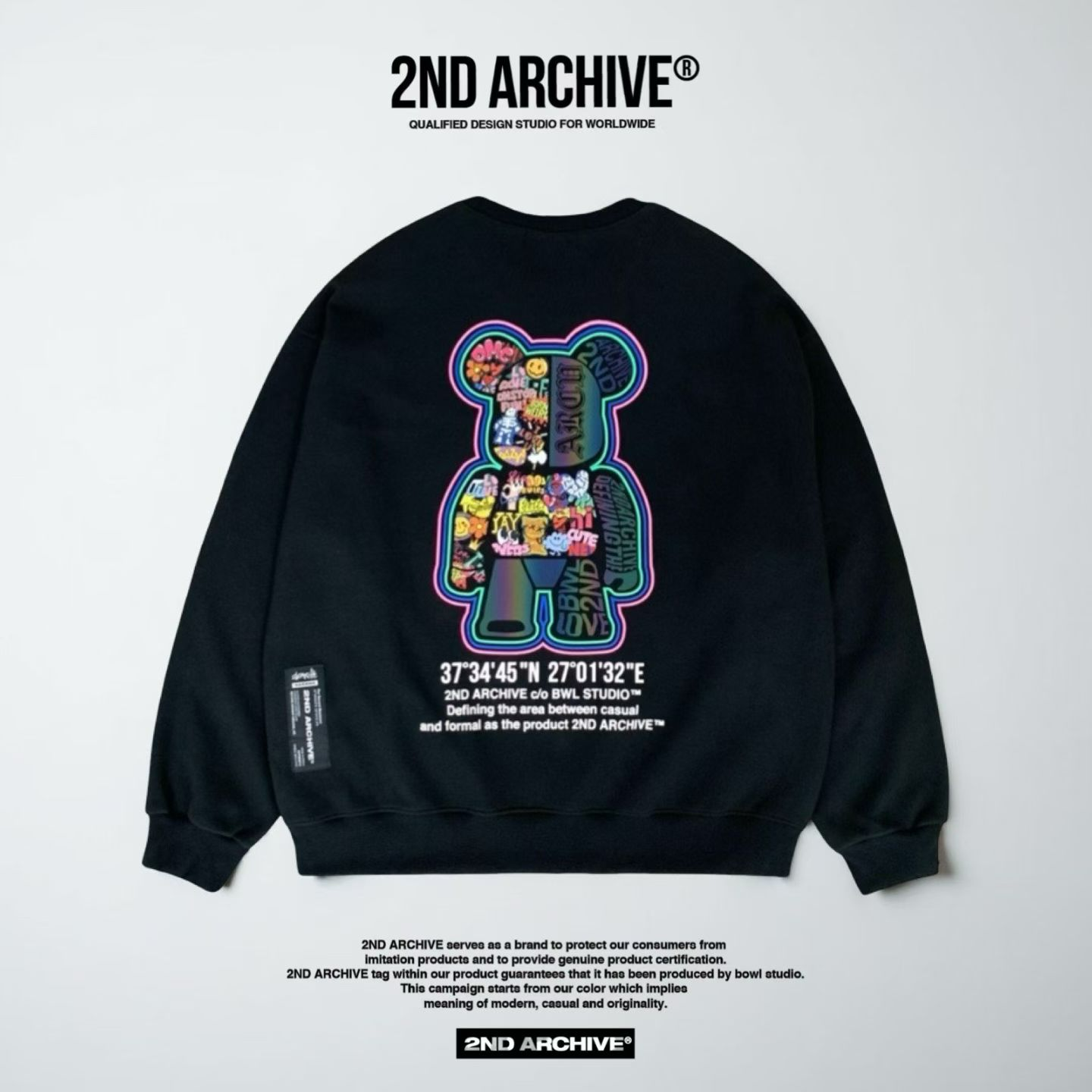 2ND ARCHIVE 正韓反光塗鴉熊熊寬版衛衣 黑/奶油/湖水綠