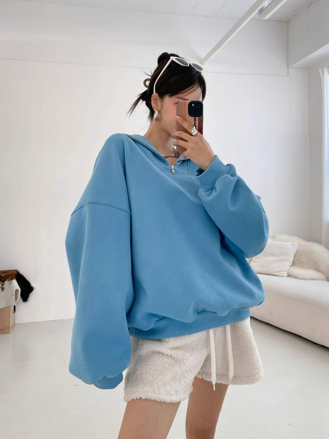 正韓半開襟大落肩冷調寬鬆衛衣|黑/灰/藍