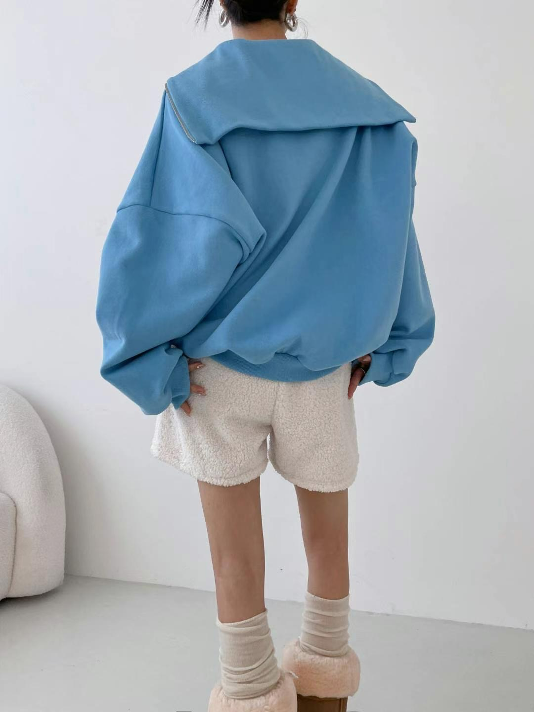 #中性寬鬆衛衣 #冷調鬆弛感 #半開拉鍊翻領 #冬季休閒穿搭 #韓系冷淡風 #低調存在感穿搭 #大落肩上衣 #中性冬季單品